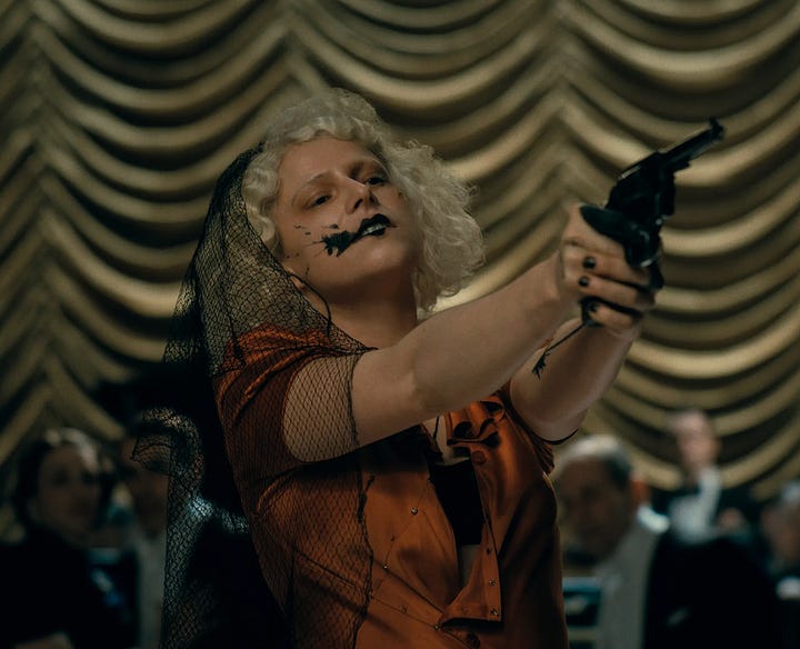 Okay so her cool look and her ability to shoot a gun leads hoards of women to take up her style and engage in random acts of violence. This is the revolution! I get it, the movie takes place in the 1930s, so sure, it’s bold of these ladies to be wearing these things and getting loud and aggressive. They yell “brain attack!” the way that The Bride did3, and they smash windows and beat up men and that’s great. Truly! I love that! But I am not sure what the revolution is beyond black lipstick and random acts of violence. Again, I get it, repression and women’s rage. Cool! But….The Bride didn’t really have a vision? She made a few comments about men’s violence and that mob boss (AGAIN!) and then ran away with her monster man. Which is fine, I mean you do you, Ida! You deserve to have fun!