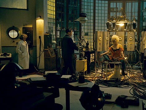 The Bride! is framed by cuts of Mary Shelley (also played by Jessie Buckley)2 speaking to the camera as speaking to Ida aka the titular Bride. Ida’s journey into becoming The Bride begins with Mary Shelley…possessing her. This is how Shelley tells the rest of Frankenstein. Or, at least, this is what Gyllenhaal uses to have Shelley tell the rest of Frankenstein the way that Gyllenhaal imagined. Ida begins to go in and out of Shelley’s accent and lexicon. Which is awkward enough at any time, but especially when you’re sitting at a table with a bunch of gross men who work for a mob boss and the mob boss is also present. In her weird trance, Ida starts spilling ALLLLLL the mob secrets. UH OH! That’s no good. This whole debacle results in her falling down a steep flight of stairs to her death. But don’t worry, Shelley’s ghosts tells us that something is coming.